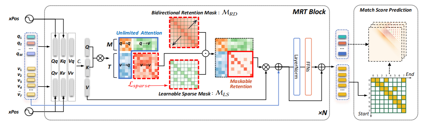 视频时刻检索(MR)旨在根据自然语言或语音查询,从未修剪的视频中定位目标时刻。本文提出了一种新颖的可掩蔽保留网络(MRNet),以应对MR任务中的两大挑战:跨模态引导和视频序列建模。MRNet在多模态Transformer中引入保留机制,并采用模态特定的注意力模式。具体而言,对语言相关区域采用无限制注意力以最大化跨模态交互;对纯视频区域则提出可掩蔽保留机制,通过双向衰减保留掩码显式建模视频片段间的时序依赖,并利用可学习的稀疏保留掩码自适应捕捉与查询相关的关键语义关联,同时设计自监督稀疏损失以消除冗余响应。在ActivityNet Captions、TACoS、Charades-STA、ActivityNet Speech和QVHighlights五个基准数据集上的大量实验表明,MRNet在自然语言、语音检索及联合任务上均显著超越了现有最先进方法,实现了性能与效率的最佳平衡。