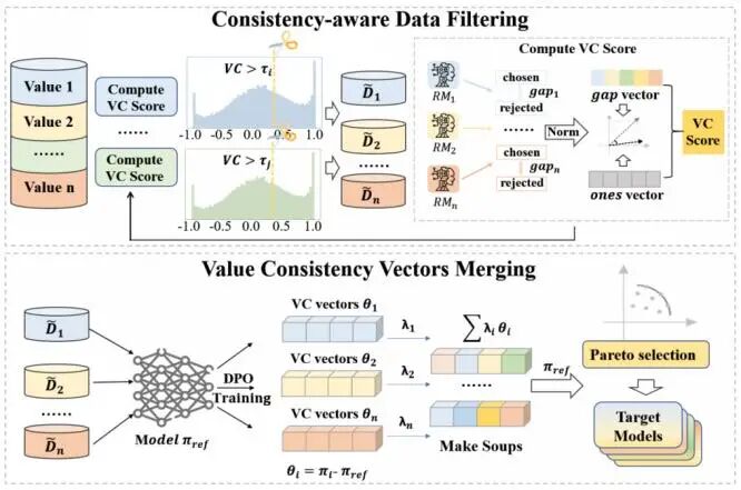 本文提出了一种基于价值一致性引导的多元价值观对齐框架VC-Soup,用于解决大型语言模型在同时对齐多种可能相互冲突的人类价值观(如有用性、安全性、诚实性)时面临的参数干扰与性能退化问题。针对现有多价值观对齐方法忽视样本层面价值观分歧、模型融合不稳定的局限,VC-Soup从数据层面出发,引入价值一致性度量指标,对多价值偏好数据进行一致性过滤,仅保留在多个价值维度上具有协同优化作用的样本,从而有效缓解跨价值梯度冲突。在此基础上,论文基于一致性数据分别训练价值一致性参数向量,并通过线性模型融合与帕累托排序,高效构建在多价值观维度上具有良好权衡关系的模型集合,无需为不同价值观组合重复训练模型。理论分析表明,该方法能够显著提升模型参数的线性模态连通性,为稳定的融合提供保障。实验显示,VC-Soup优于SOUP、MODPO 等主流方法,在多个数据集上取得了更优的价值观平衡。总体而言,VC-Soup 提供了一种高效、稳定且可扩展的多元价值观对齐方案,为以参数合并为核心的多值对齐研究指明了数据层面一致性的重要方向。