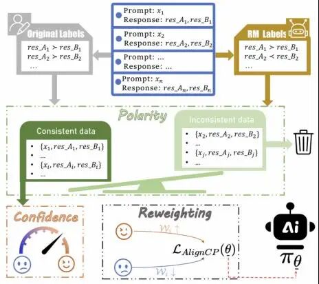 本文提出了一种轻量且可解释的数据感知偏好对齐框架AlignCP,用于缓解偏好对数据中噪声(如标签翻转、不一致评判)对DPO/偏好优化训练带来的负面影响。通过对Anthropic-HH等数据集的实证分析,本文发现约25%的偏好对在奖励模型判断与人工标注间存在明显不一致,这类样本往往无法提供有效训练信号,甚至会降级模型行为。基于此,AlignCP从奖励模型输出中构造了两个可解释信号:Confidence,用于衡量偏好判决的置信度;Polarity,用于刻画奖励排序方向与人工标注的一致性。基于二者联合设计样本权重,对高置信且方向一致的偏好对进行强化学习,对低置信或方向冲突样本进行抑制,从而在无需重标注数据的情况下有效过滤噪声干扰。实验结果表明,AlignCP在Anthropic-HH等基准数据集上显著优于DPO及其多种变体,在帮助性与安全性等指标上均取得稳定提升,且在标签翻转等噪声场景下表现出更强的鲁棒性。总体而言,AlignCP提供了一种自动化、可解释且高效的偏好数据质量控制与重权策略,为稳健地提升LLM偏好对齐性能提供了实用方案。